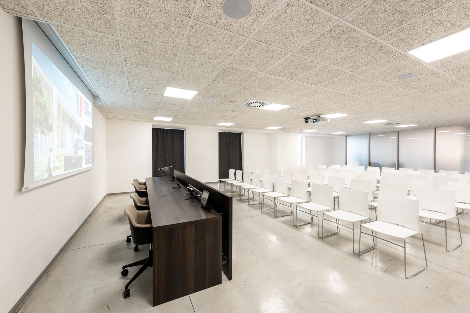 The Galileo Room is a 90-square metre multi-purpose room for up to 60 people. It is the ideal choice for conferences with a limited number of participants, presentations and business meetings. In addition, the room is equipped with all the necessary equipment to ensure efficient technical management, such as high-speed Internet connection, microphones, projection screen and quality sound system.